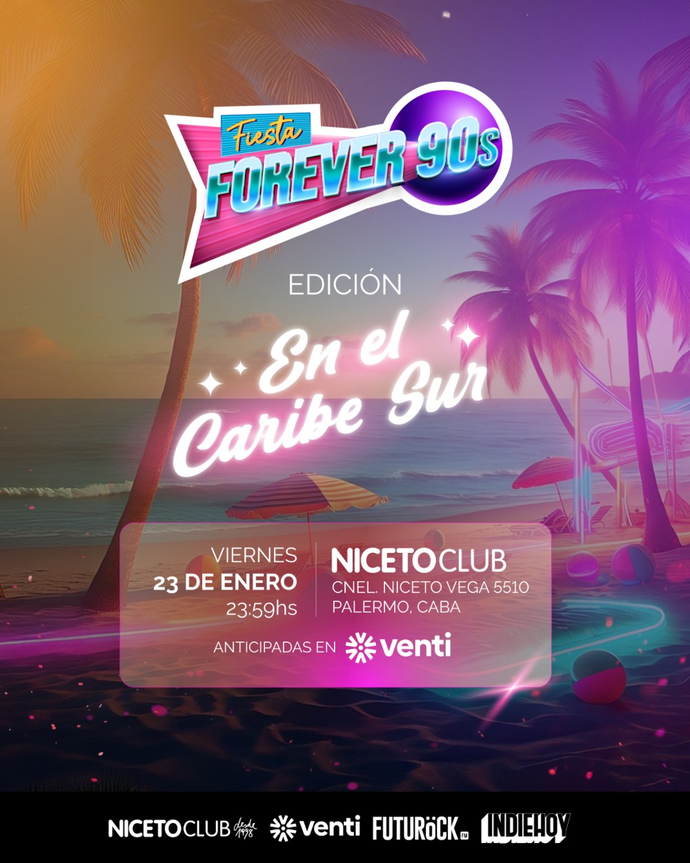 🌴✨ FIESTA FOREVER 90s | Edición EN EL CARIBE SUR 🌴✨ 📍 VIERNES 23 de ENERO | 🕛 Después de la medianoche (Apertura 00:30 am del sábado) | 📌 En NICETO CLUB, Cnel. Niceto Vega 5510, CABA ¡PRIMERA FIESTA DEL 2026! Y lo arracamos como mejor sabemos: full energía, nostalgia y HITAZO tras HITAZO de 1990 a 1999. Entramos en modo verano y viajamos directo al Caribe Sur noventoso toda la noche hasta que salga el sol 🎶 🌊 EN ESTA EDICIÓN: 🔥 🌴 Dos DJs toda la noche haciendo sonar tooodos esos temazos de tu adolescencia 🎤 Karaoke 💃 Coreos en vivo de nuestras dancers ✨ Si venís temprano te llevás regalos de nuestra década, y hay Glitter libre hasta las 2 AM! ⛱️ DRESSCODE SUGERIDO: No es obligatorio, pero suma puntos 😉 👉 Detalle playero bien noventoso: anteojos de sol, camisa abierta, musculosa, brillos, colores fuertes… lo que te pondrías para irte de vacaciones, pero en versión Forever 90s. 🎁 CUMPLEAÑEROS de ENERO! Entran GRATIS hasta la 1:30 AM presentando su DNI en boletería 👰🏼🤵🏻 Si estás por casarte y hacés tu despedida con nosotros, entrás GRATIS hasta la 1:30 AM. Dejanos tu nombre y apellido en nuestro Instagram. Más info en nuestro Instagram https://www.instagram.com/fiestaforever90s/