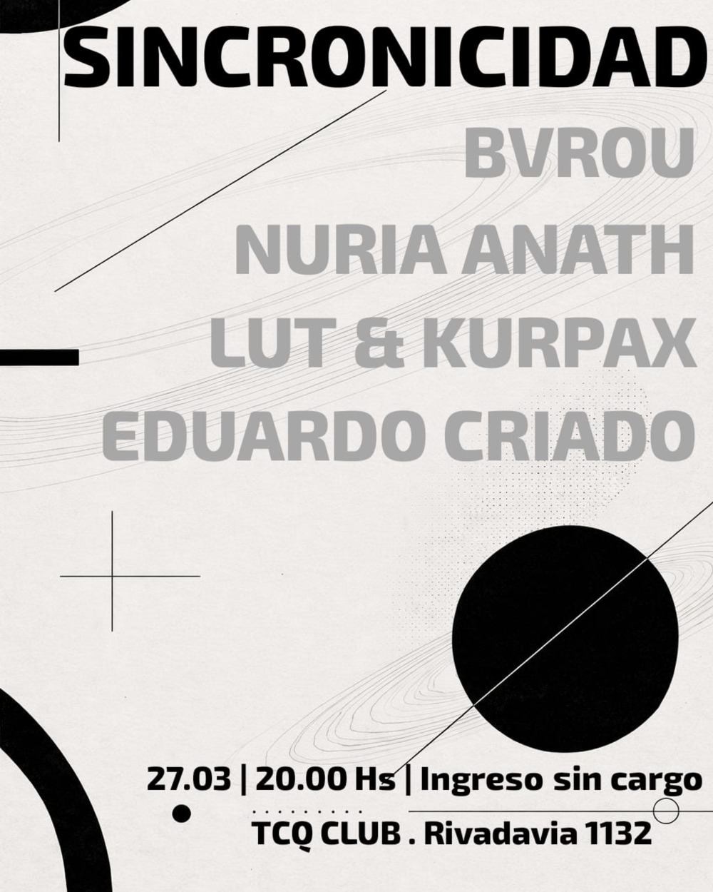 SINCRONICIDAD | VIERNES 27.03 20 HS | FRCTL BAR 📍Rivadavia 1132 INGRESO SIN CARGO __________________________________________ Continuamos con nuestro Horario After Office, En la planta alta de TCQ CLUB., más precisamente En FRCTL BAR Formato Boiler Te esperamos para que disfrutes junto a nosotros! Ingreso sin cargo ________________________________________________ LINEUP & SETTIMES 20.00 @nuria.anath_ 21.00 @bvrou__concept 22.00 @eduardo_criado73 23.00 @carokurpas & @lut_killerdrumz _________________________________________________ Diseño @aureal_3 & lut. Track @eduardo_criado73 . Con el apoyo de : @analord.techno @colission.techno @homework.studio.ba @neptunescificlub @concept_techno @tres4veinte @minau.music @tcqlub @frctl.bar